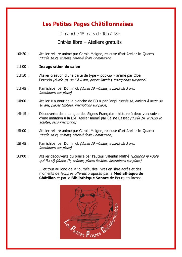 Le jour du salon, divers ateliers sont mis en place, des dédicaces aux stands des écrivains et des lectures offertes par la Médiathèque de Chatillon sur Chalaronne.